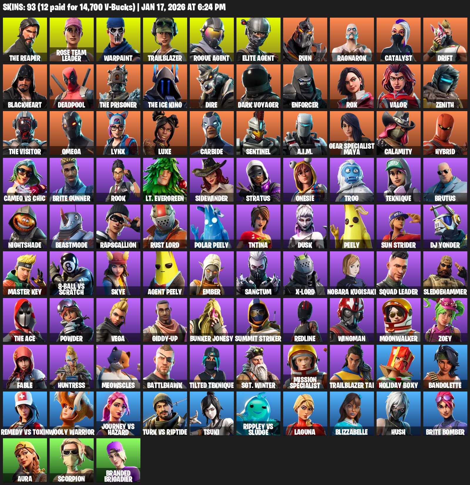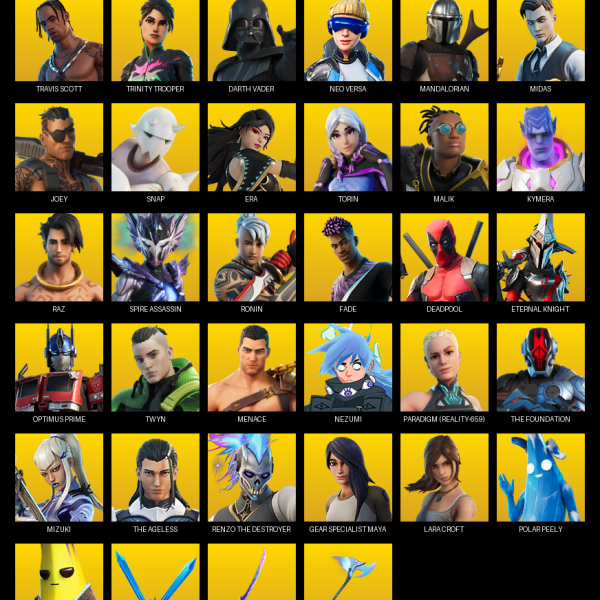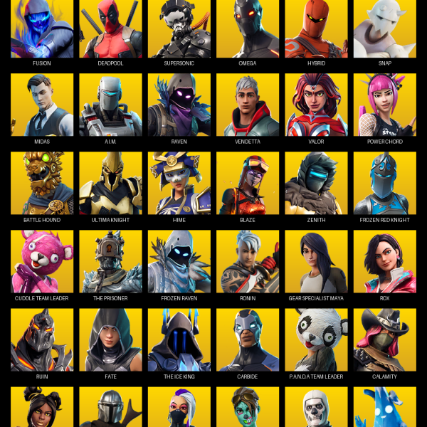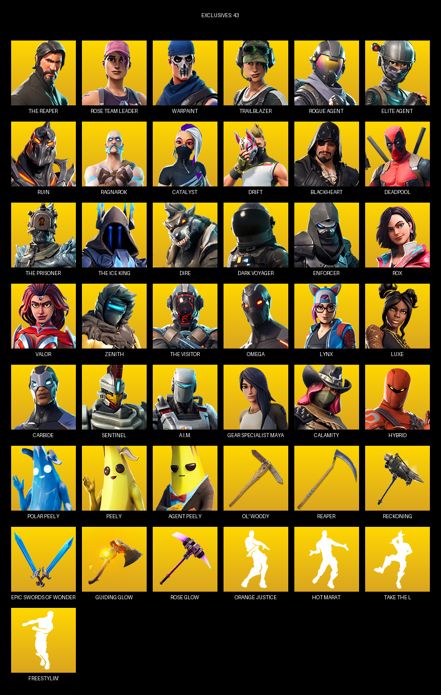 The Reaper, Elite Agent, Omega, Gear Specialist Maya, Rose Team Leader, Warpaint, Trailblazer, Ruin, Ragnarok, Catalyst, Drift, Blackheart, Deadpool, Dire, Dark Voyager, Enforcer, Rox