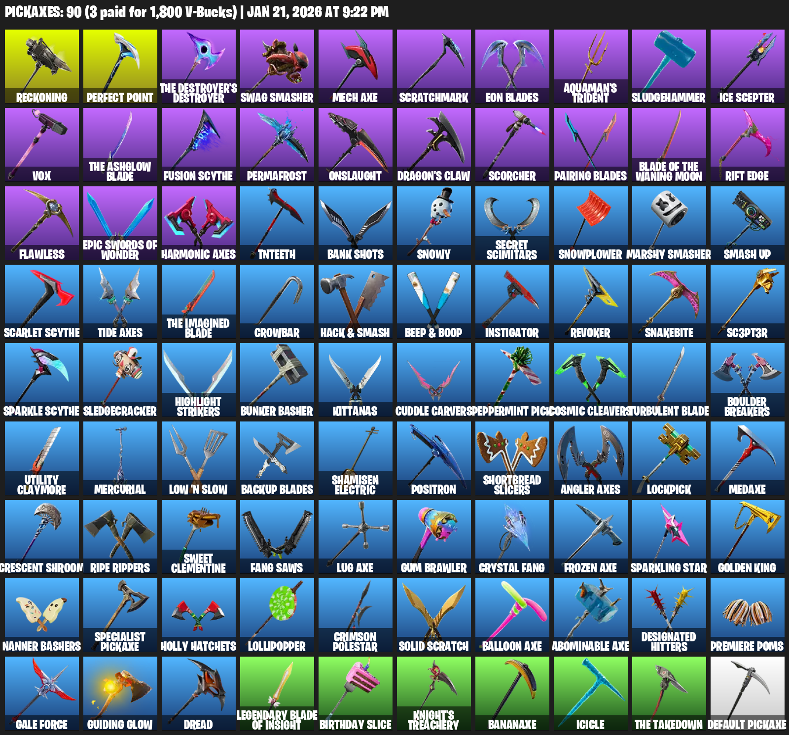 Reckoning, Swag Smasher, Mech Axe, Scratchmark, Eon Blades, Aquaman’s Trident, Sludgehammer, Vox, Permafrost, Onslaught, Dragon’s Claw, Scorcher, Rift Edge