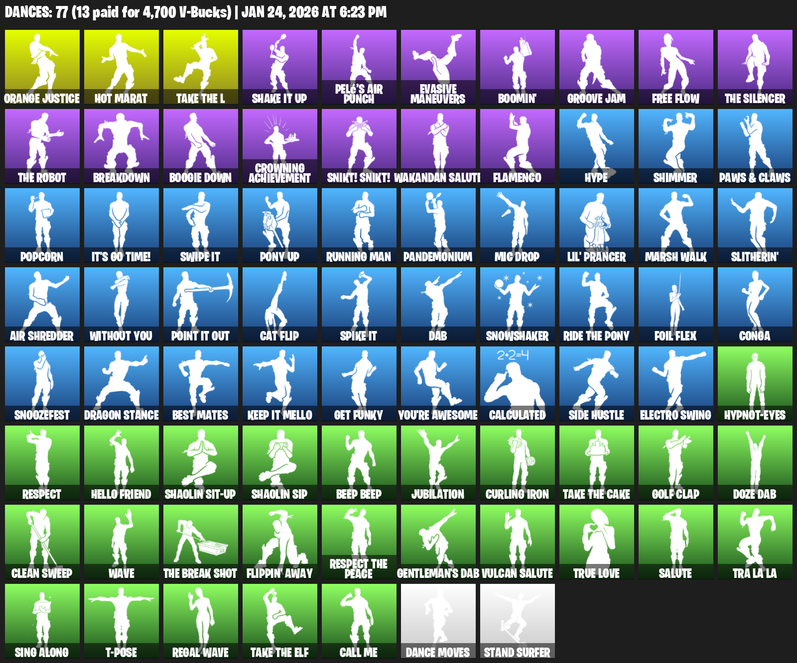 Hot Marat, Orange Justice, Shake It Up, Pelé’s Air Punch, Evasive Maneuvers, Boomin’, Groove Jam, Free Flow, Breakdown, Boogie Down, Crowning Achievement, Snikt! Snikt!, Wakandan Salute, Flamenco, Hype, Shimmer, Paws & Claws