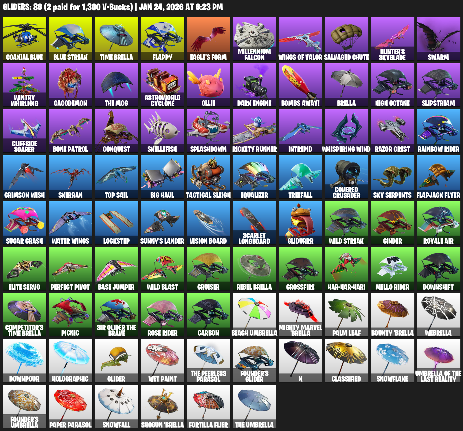 Time Brella, Flappy, Eagle’s Form, Millennium Falcon, Wings of Valor, Salvaged Chute, Hunter’s Skyblade, Swarm, Wintry Whirligig, Cacodemon, Astroworld Cyclone, Ollie, Dark Engine, Bombs Away!, High Octane, Slipstream