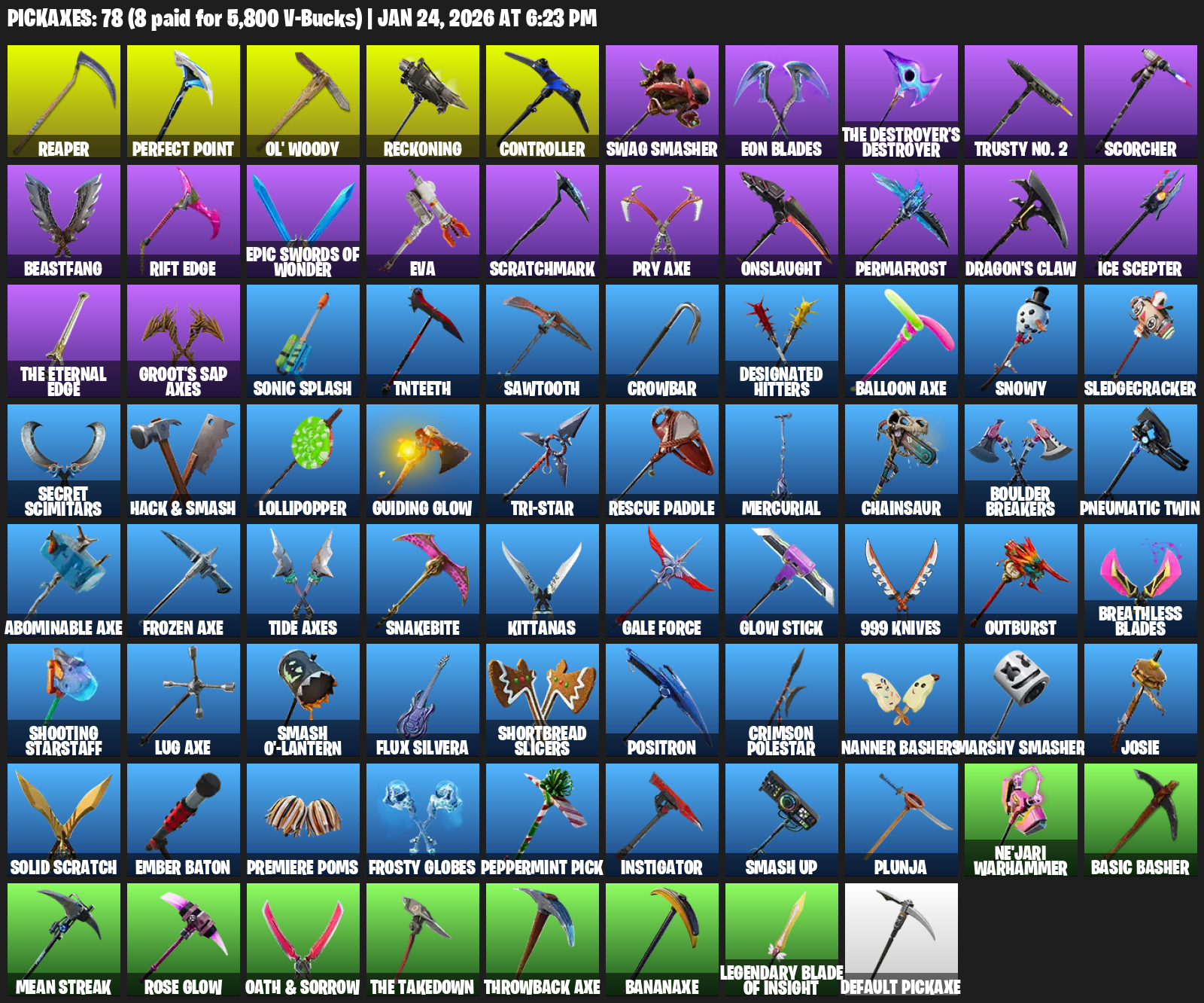 Ol’ Woody, Reckoning, Controller, Swag Smasher, Eon Blades, Trusty No. 2, Scorcher, Beastfang, Rift Edge, EVA, Scratchmark, Pry Axe, Onslaught, Permafrost, Dragon’s Claw, Ice Scepter