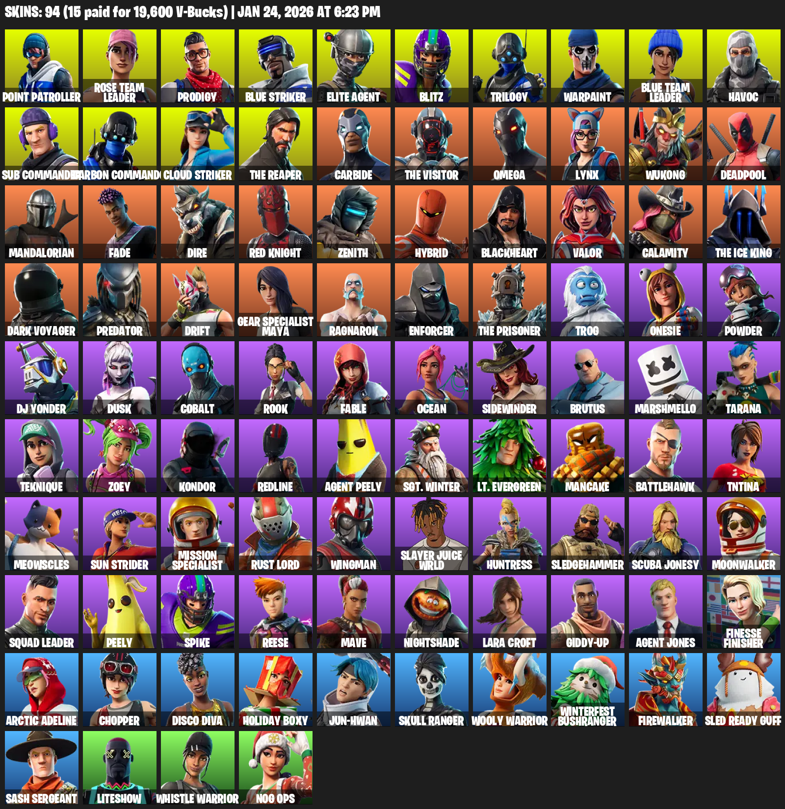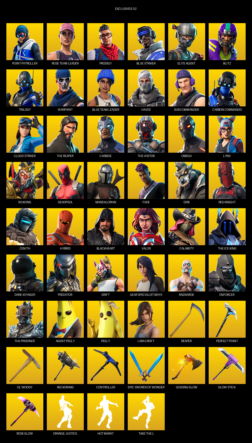 [PC/XBOX] | 94 skins | Take The L | OG STW | The Reaper | Elite Agent | Omega | Lara Croft | Point Patroller | Rose Team Leader | Prodigy | #CCX6652