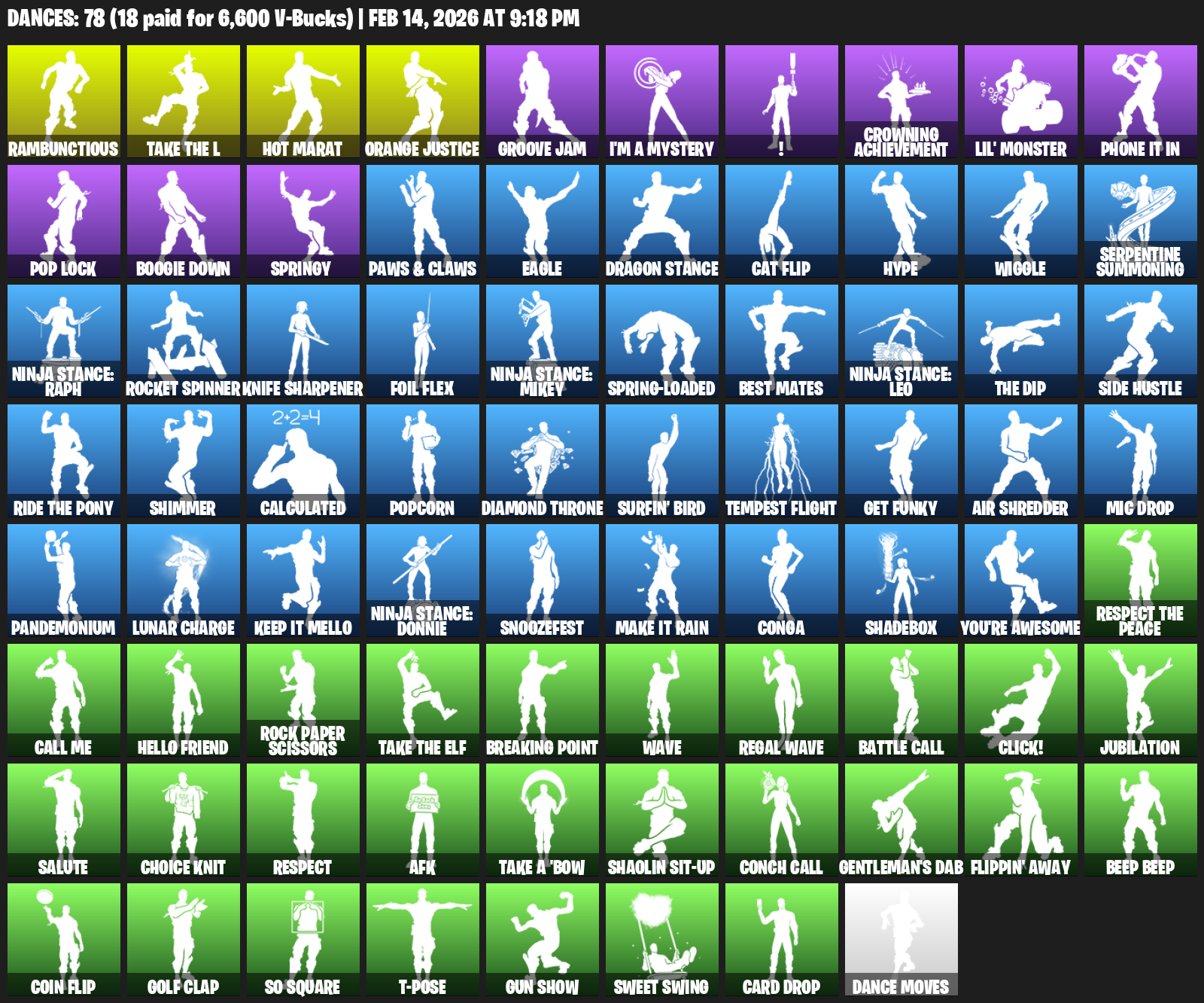 Hot Marat, Rambunctious, Orange Justice, Groove Jam, I’m a Mystery, !, Crowning Achievement, Lil’ Monster, Phone It In, Pop Lock, Boogie Down, Springy , Paws & Claws, Eagle, Dragon Stance, Cat Flip, Hype, Wiggle, Serpentine Summoning