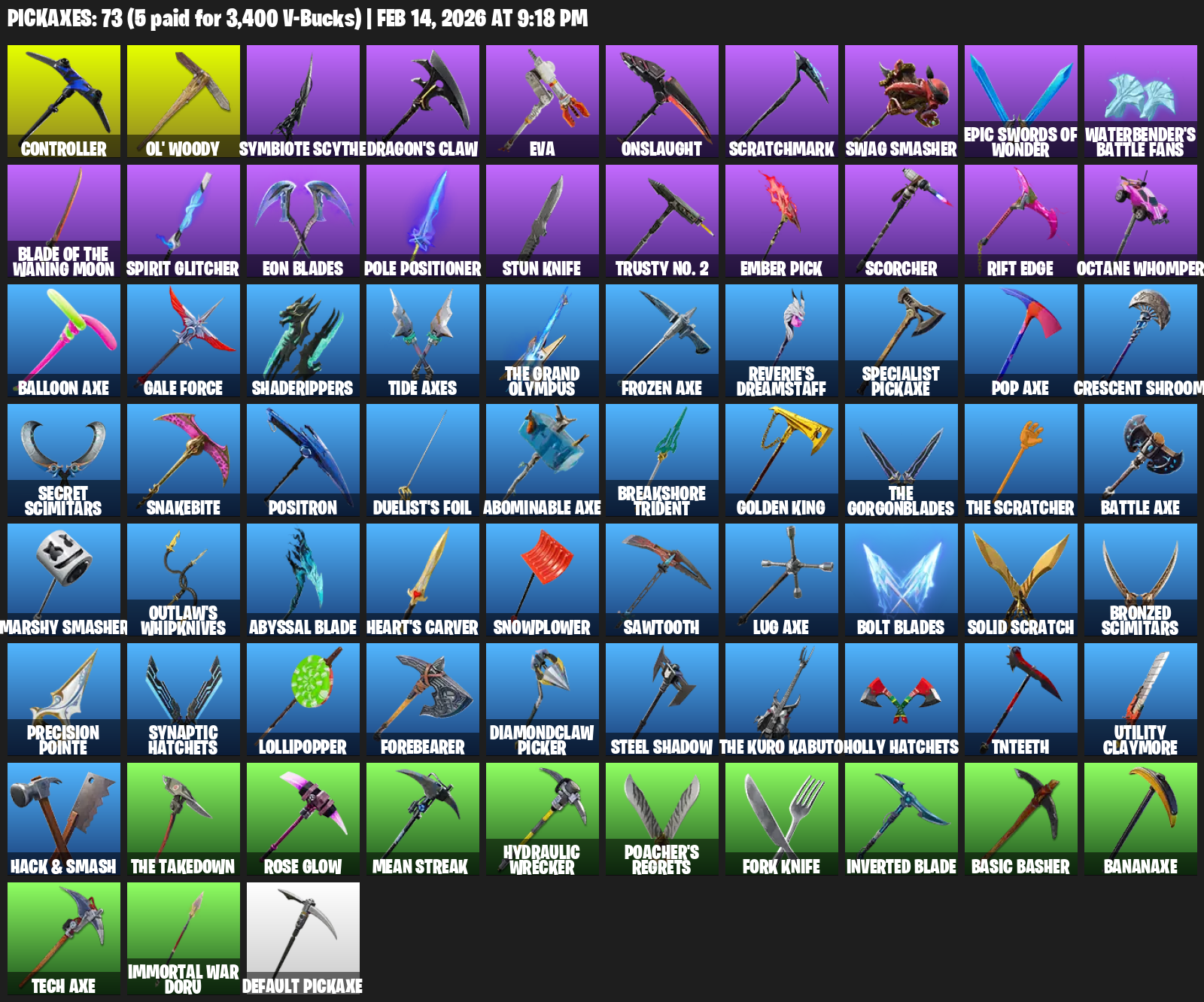Controller, Ol’ Woody, Symbiote Scythe, Dragon’s Claw, EVA, Onslaught, Scratchmark, Swag Smasher, Waterbender’s Battle Fans, Spirit Glitcher, Eon Blades, Pole Positioner, Stun Knife, Trusty No. 2, Ember Pick, Scorcher, Rift Edge, Octane Whomper