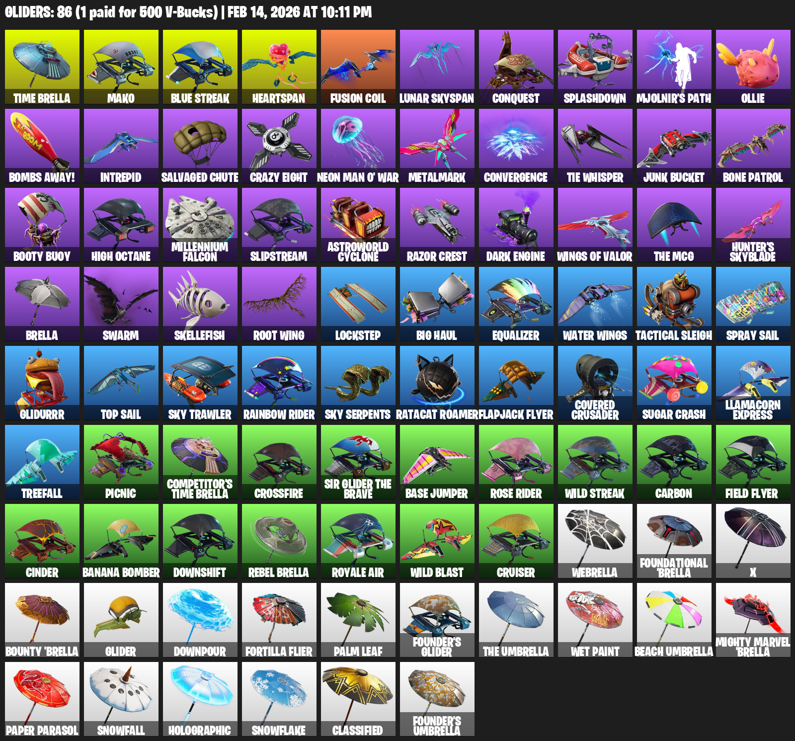 Mako, Time Brella, Heartspan, Lunar Skyspan, Conquest, Splashdown, Mjolnir’s Path, Ollie, Bombs Away!, Intrepid, Salvaged Chute, Crazy Eight, Neon Man O’ War, Metalmark, Convergence, TIE Whisper, Junk Bucket, Bone Patrol