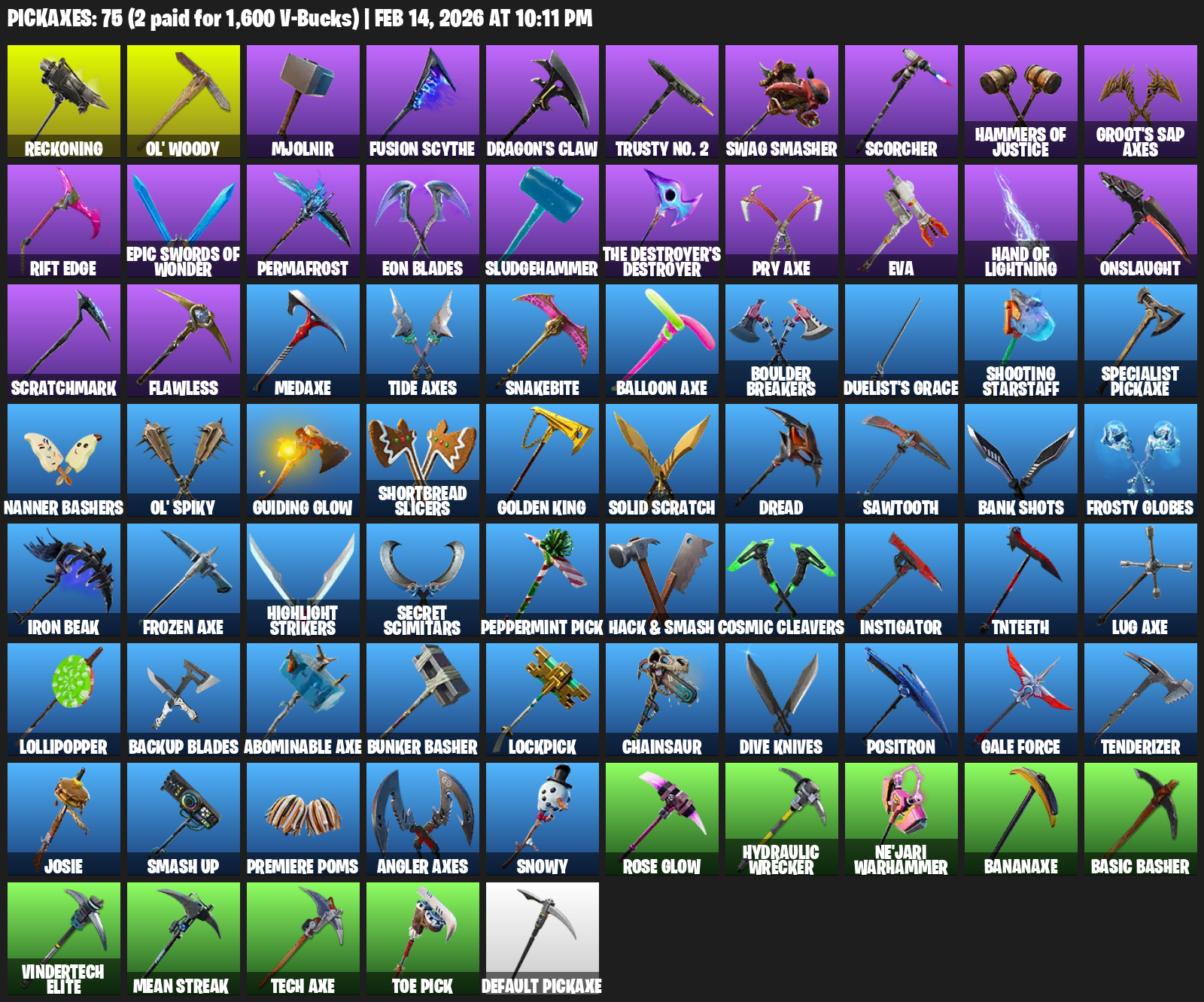 Reckoning, Ol’ Woody, Mjolnir, Fusion Scythe, Dragon’s Claw, Trusty No. 2, Swag Smasher, Scorcher, Hammers of Justice, Groot’s Sap Axes, Rift Edge, Permafrost, Eon Blades, Sludgehammer, Pry Axe, EVA, Onslaught