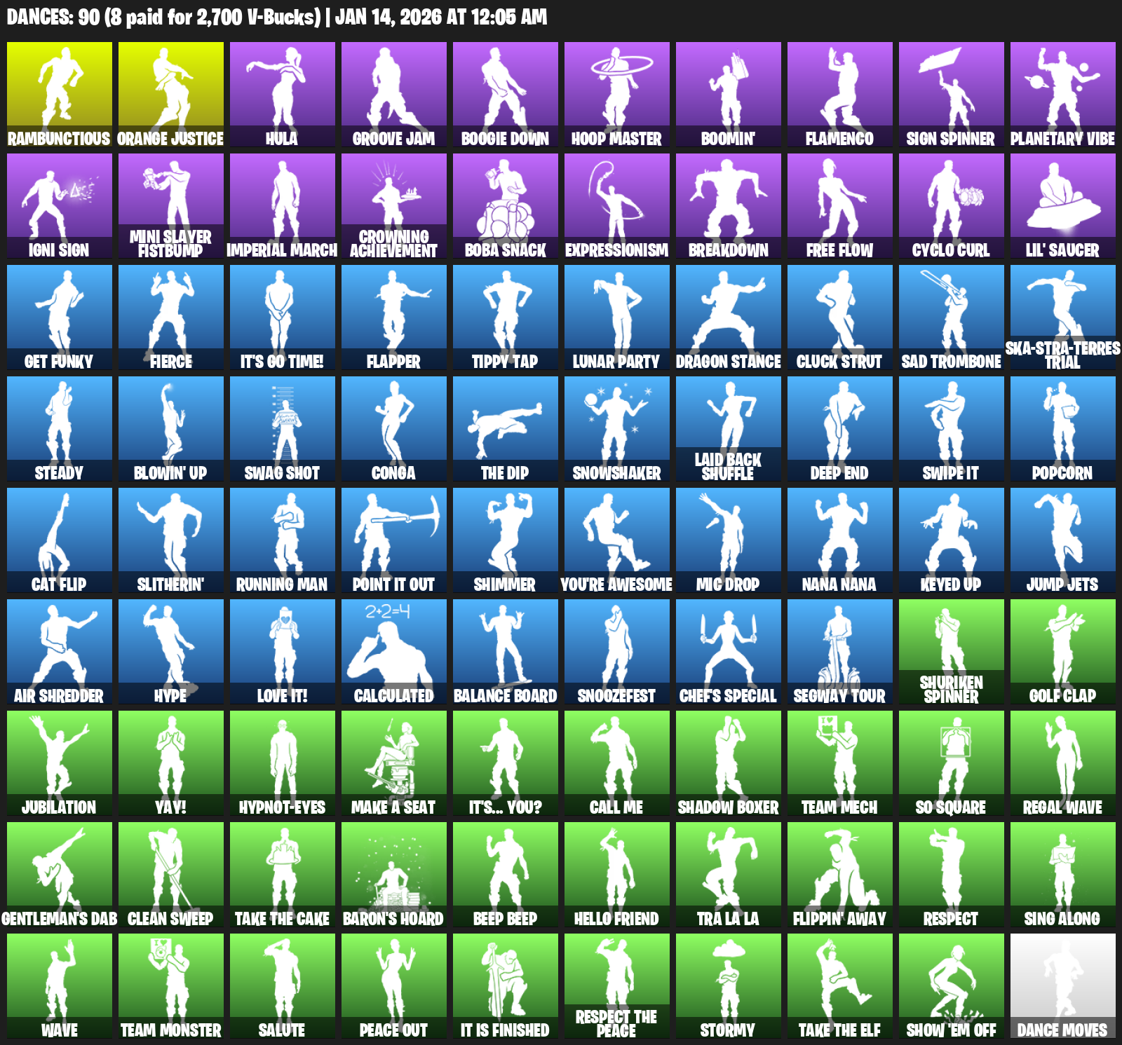 Rambunctious, Orange Justice, Hula, Groove Jam, Boogie Down, Hoop Master, Boomin’, Flamenco, Sign Spinner, Planetary Vibe, Mini Slayer Fistbump, Imperial March, Crowning Achievement, Boba Snack, Expressionism, Breakdown, Free Flow, Cyclo Curl, Lil’ Saucer