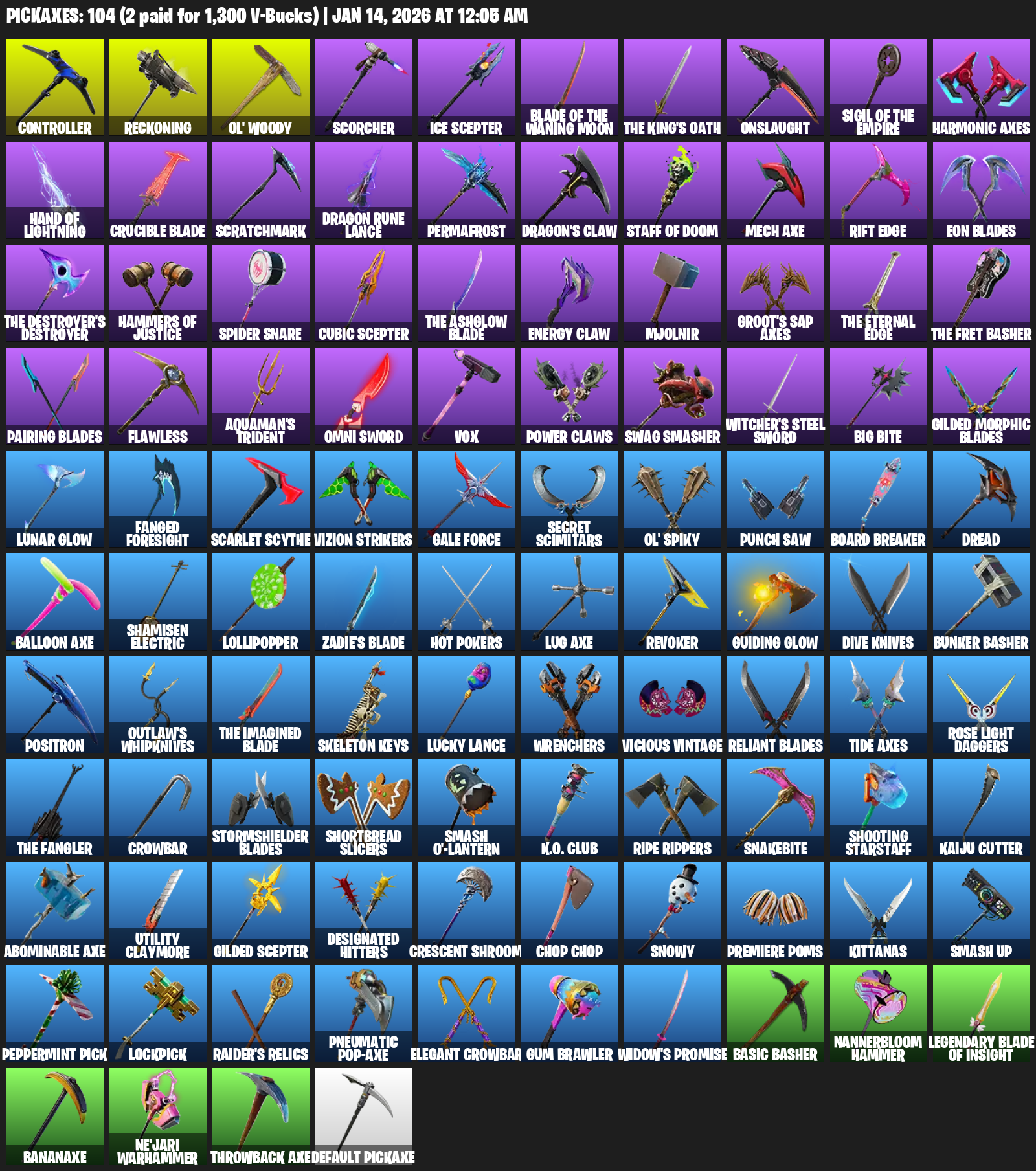 Controller, Reckoning, Ol’ Woody, Scorcher, Ice Scepter, Onslaught, Harmonic Axes, Hand of Lightning, Crucible Blade, Scratchmark, Dragon Rune Lance, Permafrost, Dragon’s Claw, Mech Axe, Rift Edge, Eon Blades