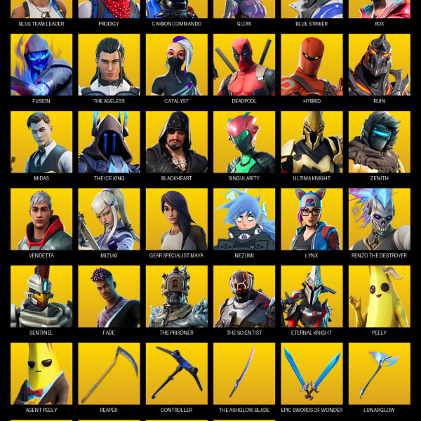 [PC] | 113 skins | Reaper Axe | Blue Team Leader | Prodigy | Carbon Commando | Glow | Blue Striker | Rox | Fusion | The Ageless | Catalyst | #NKR6393